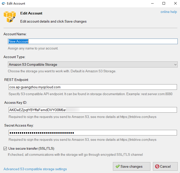 Account Type: COS는 S3와 호환되므로, 여기서 Amazon S3 Compatible Storage를 선택할 수 있습니다.
