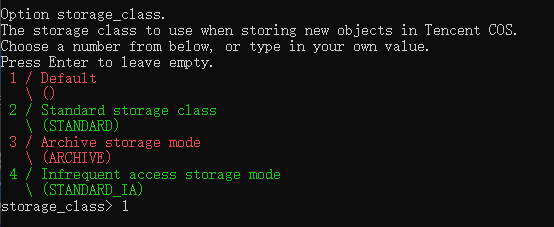 14. COS에 업로드된 객체의 스토리지 클래스를 선택합니다. 여기서는 Default가 예로 사용됩니다. 따라서 1을 입력한 다음 Enter를 누릅니다.