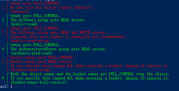 13. 필요에 따라 객체 권한(예시: default, public-read 등)을 선택합니다. 이 권한은 나중에 업로드되는 객체에만 적용됩니다. 여기서는 default가 예로 사용됩니다. 따라서 1을 입력한 다음 Enter를 누릅니다.