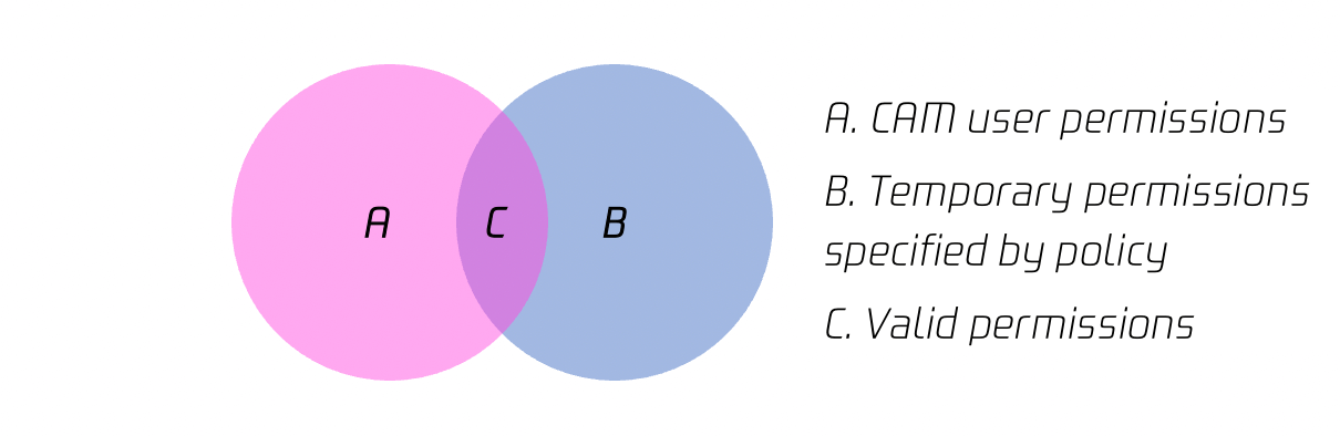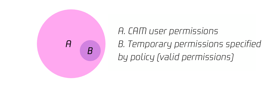 가령 ‘A’는 CAM 사용자의 원래 권한을 나타내고 ‘B’는 policy 매개변수를 통해 임시 키에 대해 설정된 권한을 나타내며 ‘A’와 ‘B’가 교차하는 것은 임시 키의 최종 유효 권한을 나타냅니다.