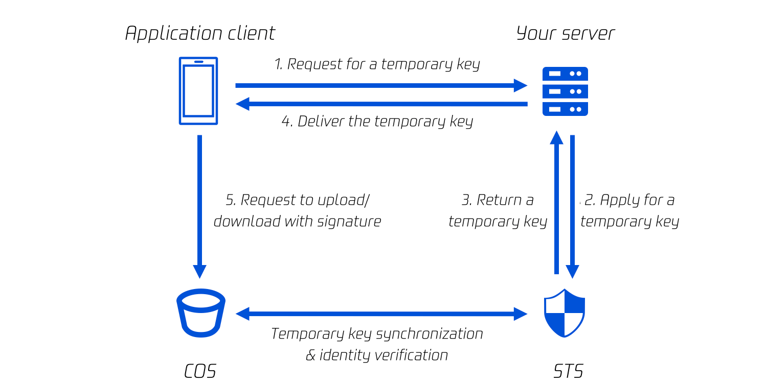임시 키는 주로 3rd party가 COS에 임시로 액세스할 수 있는 권한을 부여하는 데 사용됩니다. 예를 들어 사용자가 클라이언트 App을 개발하여 COS 버킷에 데이터를 저장하는 경우 이때 영구 키를 App 클라이언트에 직접 저장하는 것은 안전하지 않지만 클라이언트에게 업로드 및 다운로드 권한을 부여해야 하는 이런 시나리오에서 임시 키를 사용할 수 있습니다.