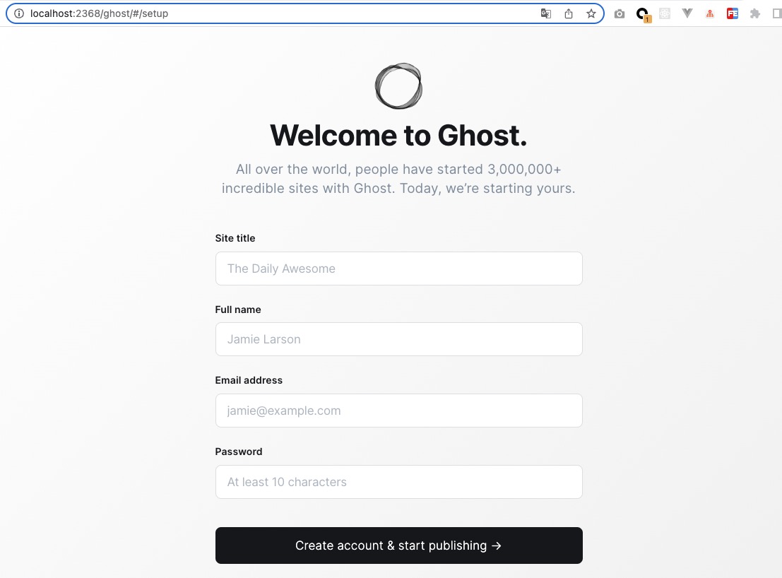 4. 브라우저를 열고 localhost:2368에 액세스합니다. 가입 페이지에서 계정에 가입하고 관리 백엔드로 이동합니다.