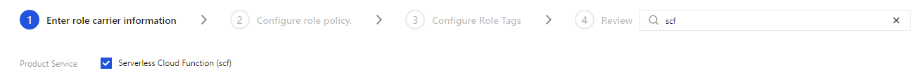 1. CAM 콘솔에 로그인하여 역할>새 역할 생성>Tencent Cloud 제품 서비스를 클릭합니다. 새 사용자 정의 역할 페이지에서 제품 서비스를 검색하고 Serverless Cloud Function(SCF)를 선택한 후 다음 단계를 클릭합니다. 2. 정책 목록에서 QcloudCOSBucketConfigRead 정책과 QcloudConfigFullAccess 정책을 검색하여 선택합니다. 완료 후 다음 단계를 클릭합니다.