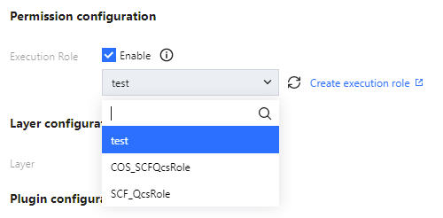 5. SCF 생성 페이지로 돌아갑니다. 권한 구성에서 실행 역할을 새로고침합니다. 그다음 새로 생성한 역할을 선택합니다.
