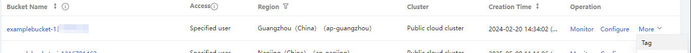 태그별. 지정 태그의 버킷을 점검해야 하는 경우, COS 콘솔의 버킷 목록 페이지에서 점검이 필요한 버킷에 태그를 설정할 수 있습니다. 버킷 목록 페이지로 이동합니다.