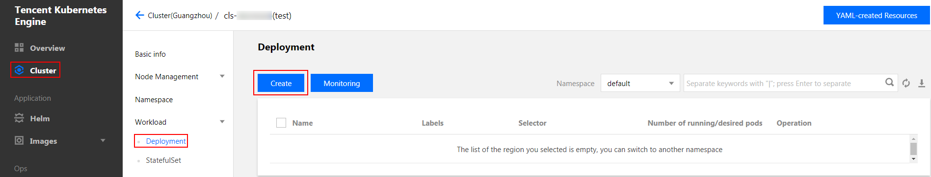 1. TKE 콘솔에 로그인하고 왼쪽 사이드바에서 Cluster를 선택합니다. 2. ‘Cluster Management’ 페이지에서 서비스를 생성할 클러스터의 ID를 클릭하여 아래 그림과 같이 클러스터의 ‘Deployment’ 페이지로 이동한 후 Create를 클릭합니다.