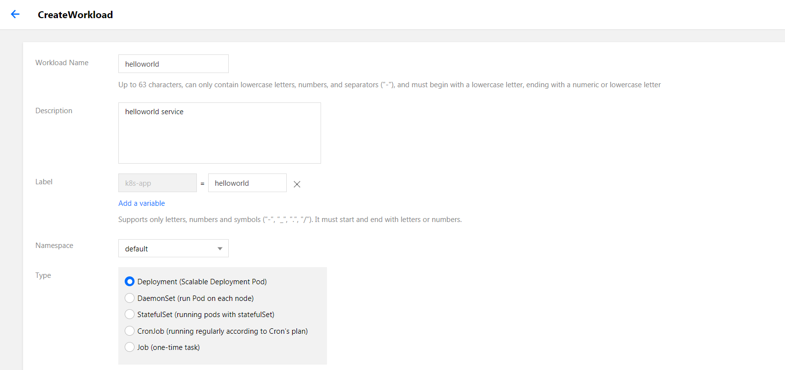 Workload Name: 생성할 워크로드의 이름을 입력합니다. 이 예시에서는 wordpress를 사용합니다.