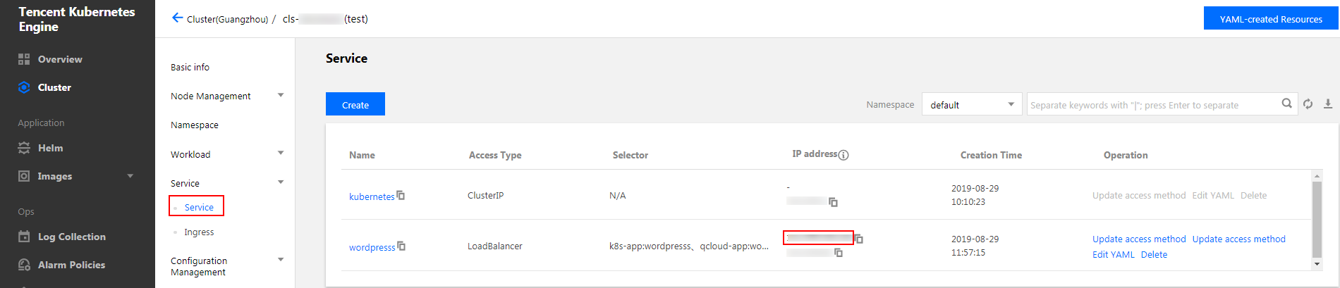 3. 서비스 관리 페이지에서 아래 그림과 같이 WordPress 서비스의 CLB IP 주소를 복사합니다.