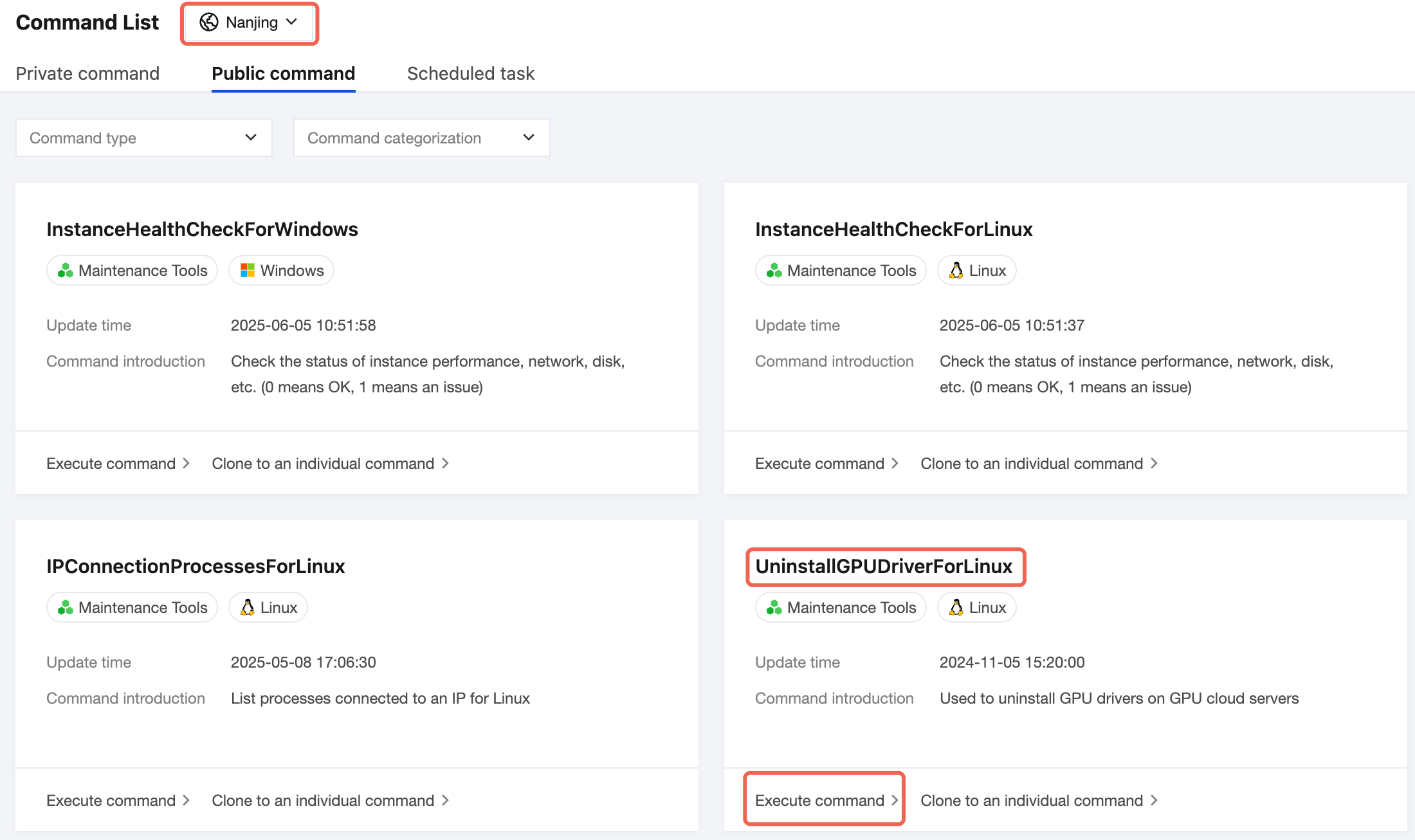 1. Log in to the CVM console, choose TencentCloud Automation Tools > Command List in the left sidebar. 2. On the Public Command page, select the region where your instance is located at the top, and click Execute command in the lower-left corner of the UninstallGPUDriverForLinux module. See the figure below: