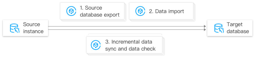 전체 마이그레이션: 원본 데이터베이스의 시스템 테이블을 제외한 모든 데이터를 타깃 데이터베이스로 한 번에 마이그레이션합니다. 전체 마이그레이션은 원본 인스턴스에 데이터가 기록되지 않는 시나리오에 적용할 수 있는 일회성 마이그레이션입니다.