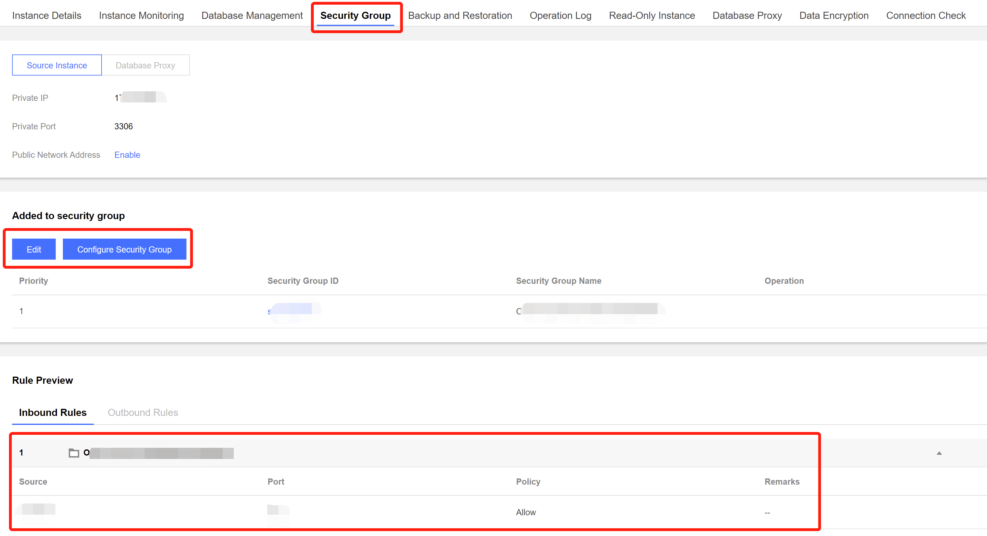 1.1 해당 데이터베이스에 로그인한 후, 인스턴스 목록에서 인스턴스 ID를 클릭하여 인스턴스 관리 페이지로 이동합니다. 1.2 인스턴스 관리 페이지에서 보안 그룹 탭을 선택하고 DTS의 SNAT IP 범위를 차단하는 정책이 있는지 확인합니다.