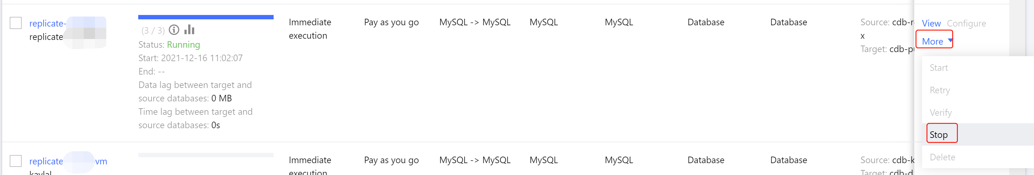 작업은 중지되기 전에 다음 조건을 충족해야 합니다. 원본/대상 데이터베이스 데이터 간격은 0MB이고 원본/대상 데이터베이스 시간 지연은 0초입니다.