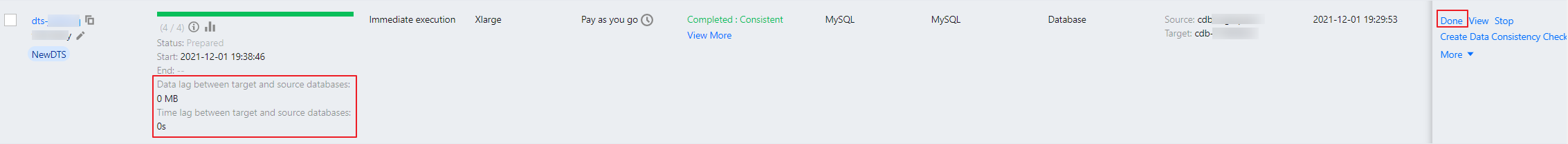 데이터 일관성 확인 | ‘전체 + 증분 마이그레이션’을 선택하면 데이터 일관성 검사를 수행하여 마이그레이션 후 원본 데이터베이스와 대상 데이터베이스의 데이터를 주의 깊게 비교할 수 있습니다. ‘전체 확인’을 선택한 경우 마이그레이션 작업이 ‘증분 동기화’ 단계에 들어가면 시간 지연이 0초이고 대상 데이터베이스와 원본 데이터베이스 간의 데이터 간격이 0MB이면 DTS가 자동으로 데이터 일관성 검사 작업을 트리거합니다. ‘전체 확인’이 선택되지 않은 경우 작업이 ‘증분 동기화’ 단계로 들어갈 때 확인 작업을 수동으로 트리거할 수 있습니다. 자세한 내용은 데이터 일관성 검증 생성을 참고하십시오. |
