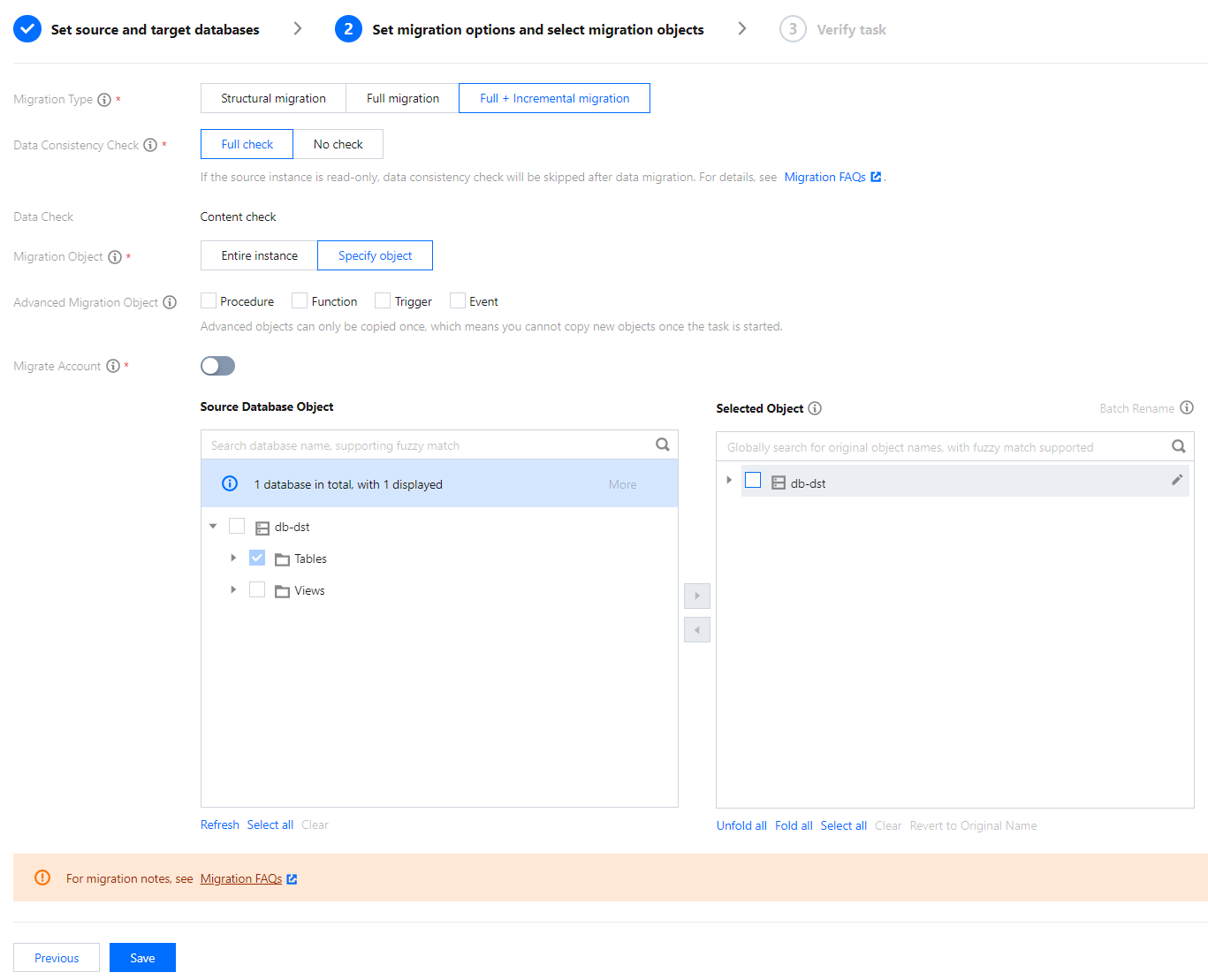 마이그레이션 유형 | 시나리오에 따라 유형을 선택하십시오. 구조적 마이그레이션: 데이터베이스 및 데이터베이스의 테이블과 같은 구조적 데이터가 마이그레이션됩니다. 전체 마이그레이션: 전체 데이터베이스의 데이터베이스/테이블 구조 및 전체 데이터가 마이그레이션됩니다. 마이그레이션된 콘텐츠에는 작업이 시작될 때 원본 데이터베이스의 기존 데이터만 포함되며 작업이 시작된 후 원본 데이터베이스에 기록된 증분 데이터는 포함되지 않습니다. 전체 + 증분 마이그레이션: 데이터베이스/테이블 구조 및 전체 데이터베이스의 데이터가 마이그레이션됩니다. 마이그레이션된 콘텐츠에는 작업이 시작될 때 원본 데이터베이스의 기존 콘텐츠와 작업이 시작된 후 원본 데이터베이스에 기록된 증분 데이터가 포함됩니다. 마이그레이션 중에 원본 데이터베이스에 데이터 쓰기가 있고 논스톱 방식으로 원활하게 데이터를 마이그레이션하려면 이 옵션을 선택하십시오. |