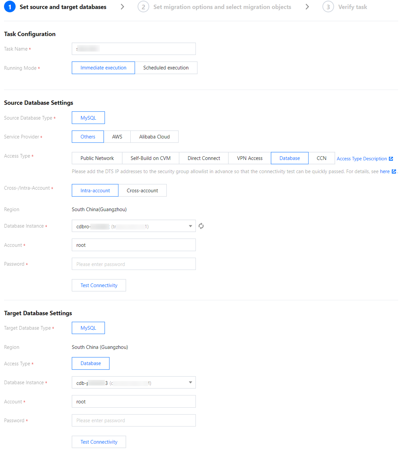 | 교차 계정/계정 내 | 계정 내: 원본 및 대상 데이터베이스 인스턴스는 동일한 Tencent Cloud 루트 계정에 속합니다. 교차 계정: 원본 및 대상 데이터베이스 인스턴스는 서로 다른 Tencent Cloud 루트 계정에 속합니다.다음은 동일한 계정으로 마이그레이션을 예로 사용합니다. |