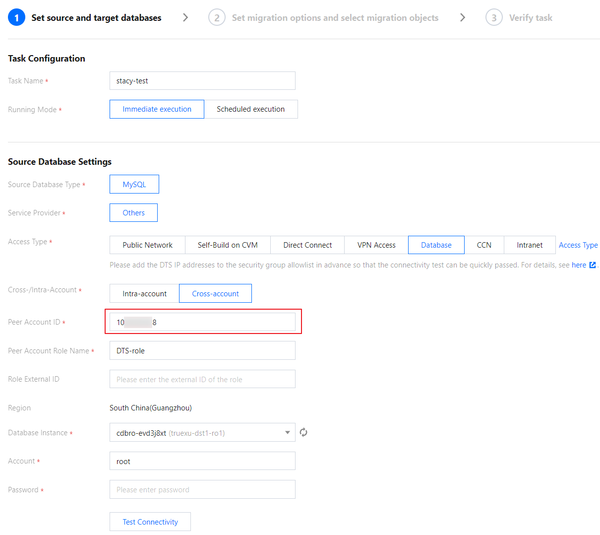 피어 계정 ID: 원본 데이터베이스의 루트 계정 ID를 입력합니다.