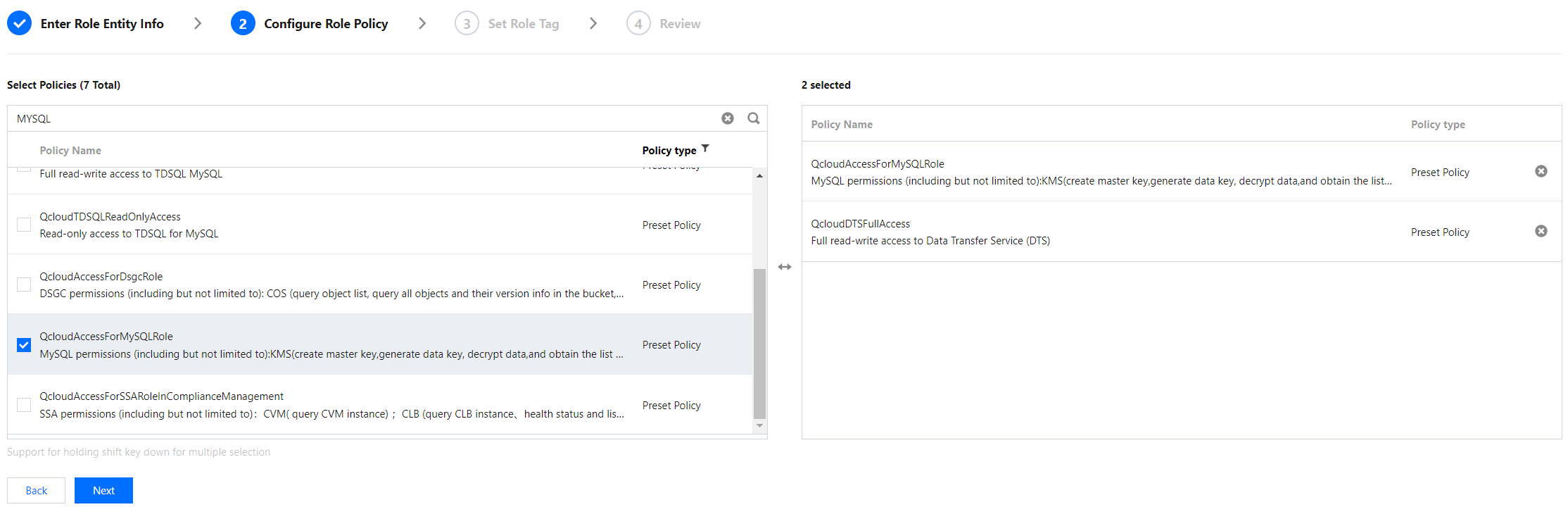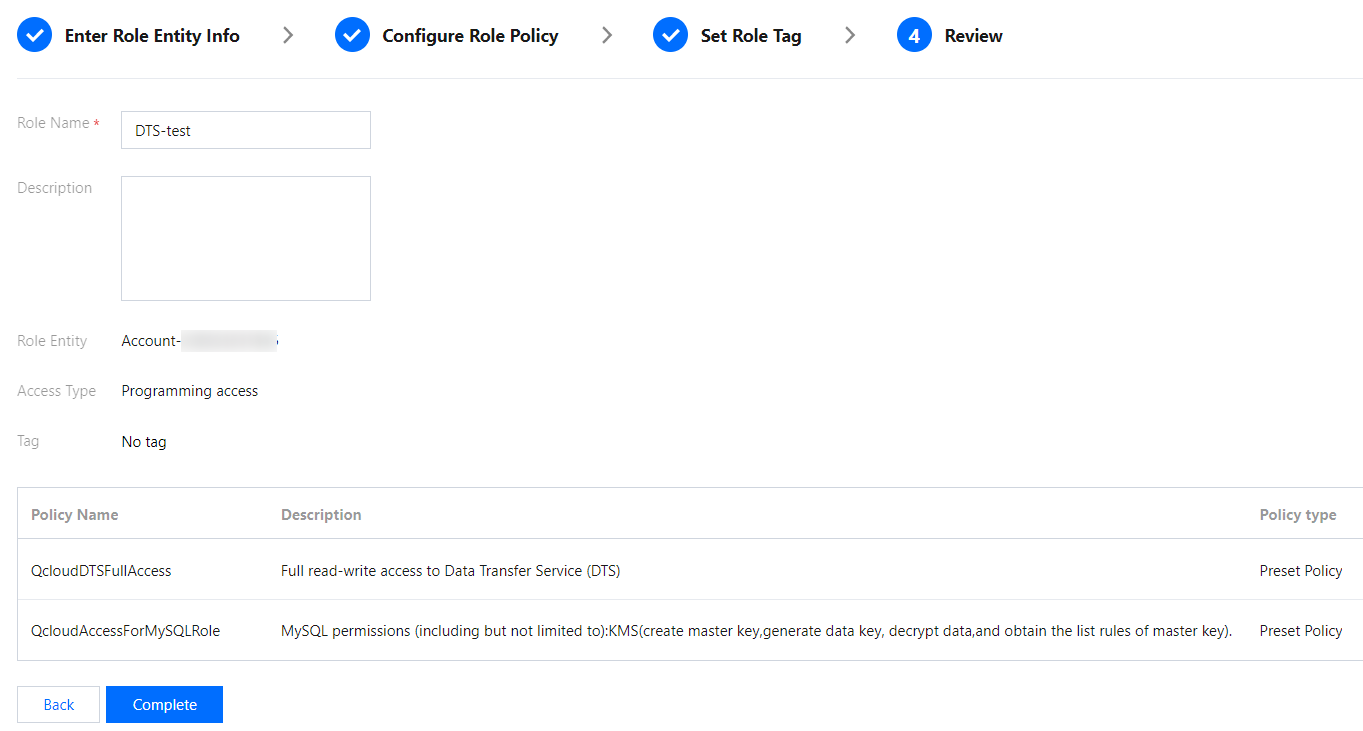 DTS 정책은 QcloudDTSReadOnlyAccess(Data Transfer Service(DTS) 읽기 전용 액세스)를 선택합니다.