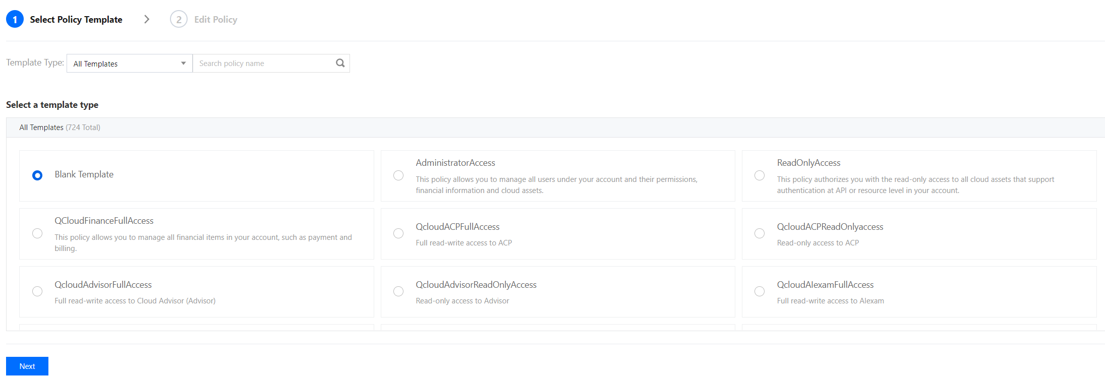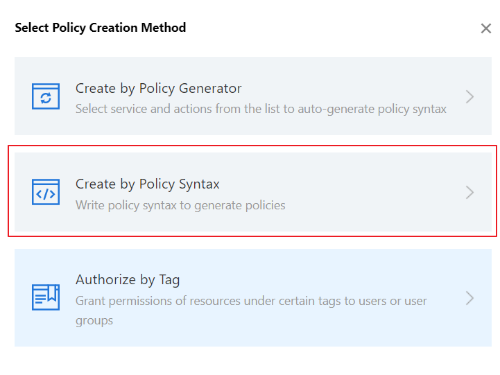 7. (옵션)대상 데이터베이스의 Tencent Cloud 루트 계정으로 CAM 콘솔에 로그인한 후 정책을 클릭합니다. 그런 다음 오른쪽의 사용자 정의 정책 생성을 클릭하고 정책 구문으로 생성을 선택합니다. 8. (옵션) 빈 템플릿을 선택하고 다음을 클릭합니다.