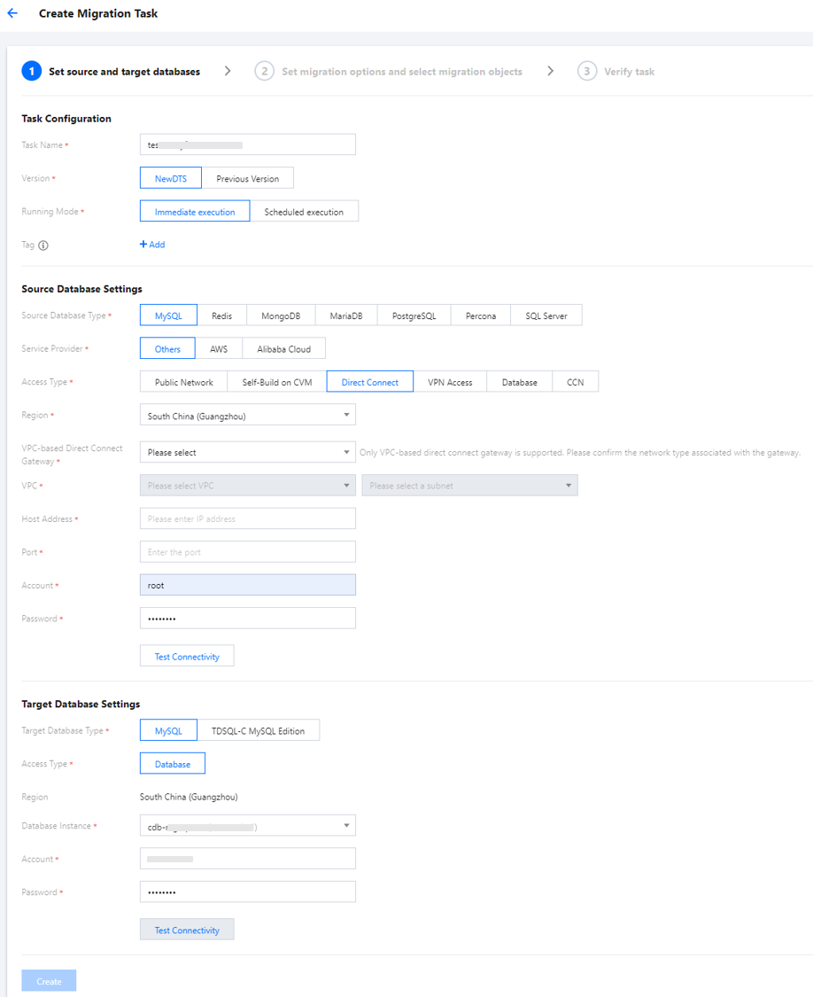 3. 원본과 타깃 데이터베이스 설정 페이지에서 작업 설정, 원본 데이터베이스 설정 및 타깃 데이터베이스 설정을 완료하고, 원본 데이터베이스와 타깃 데이터베이스의 연결성 테스트 통과 시 생성을 클릭합니다.