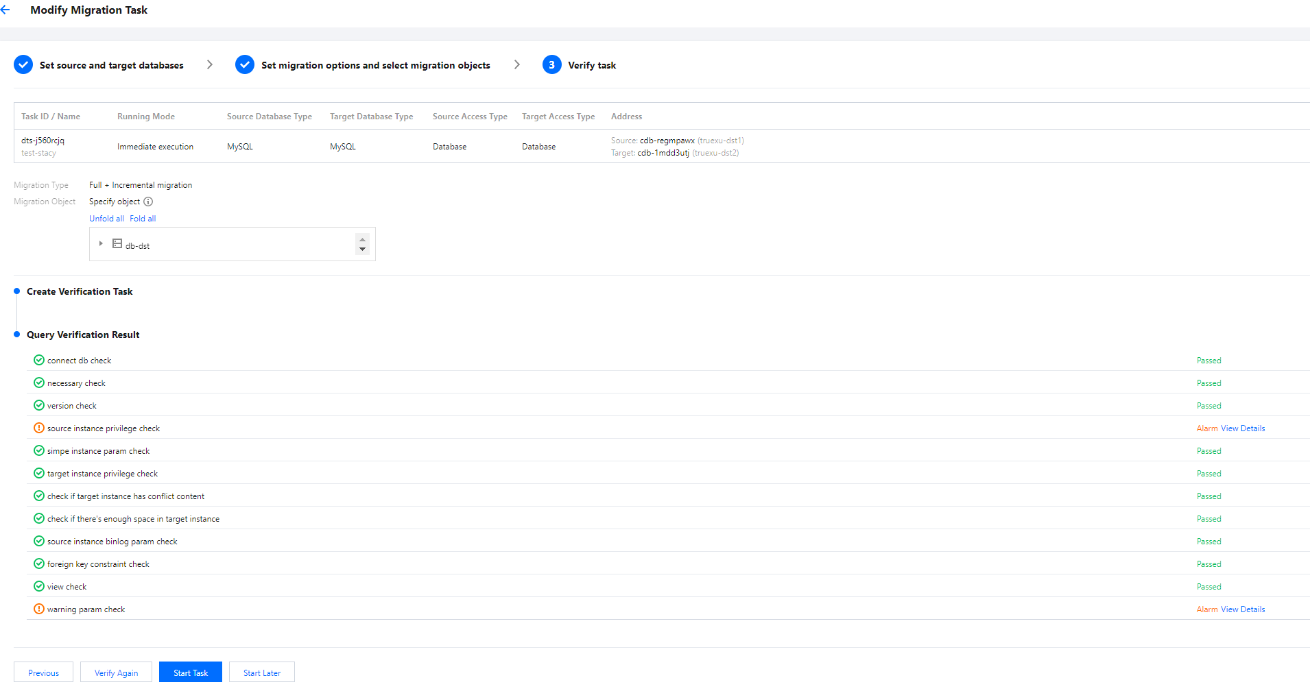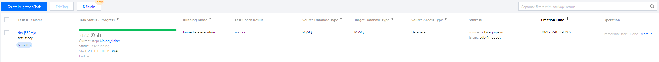 전체 + 증분 마이그레이션 선택: 전체 마이그레이션이 완료된 후 마이그레이션 작업은 자동으로 중지되지 않는 증분 데이터 동기화 단계에 자동으로 들어갑니다. 증분 데이터 동기화를 수동으로 중지하려면 완료를 클릭해야 합니다.