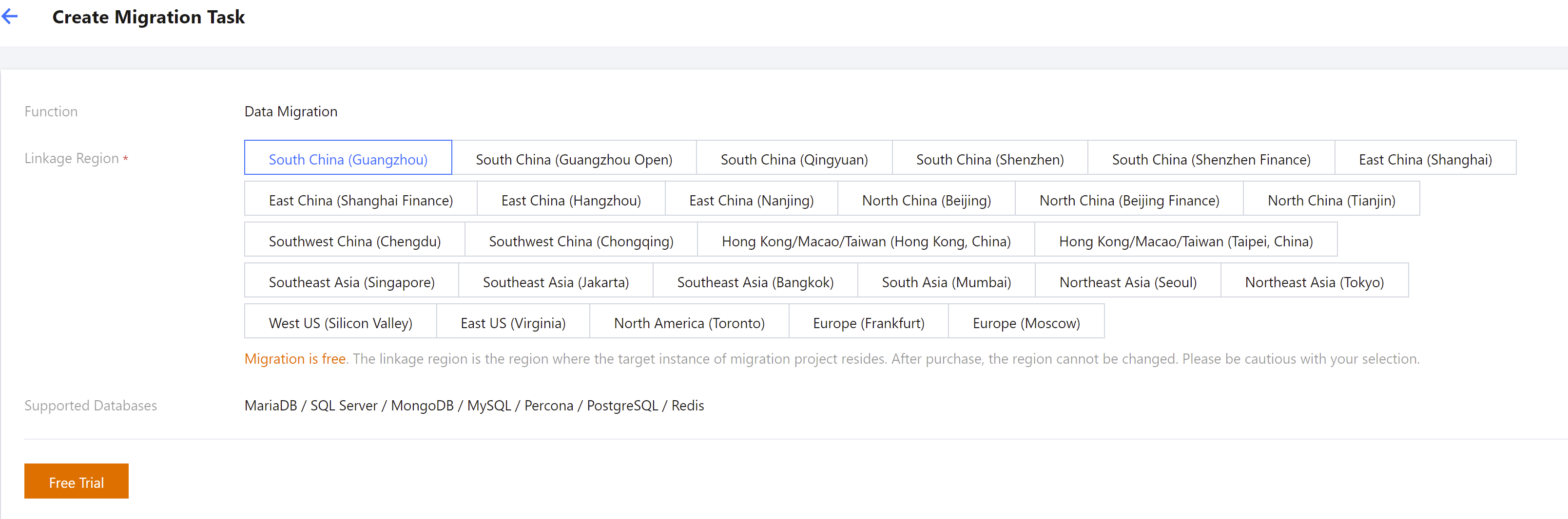 1. DTS 콘솔에 로그인하고 왼쪽 사이드바에서 데이터 마이그레이션을 선택한 다음 마이그레이션 작업 생성을 클릭하여 마이그레이션 작업 생성 페이지로 이동합니다. 2. 마이그레이션 작업 생성 페이지에서 원본 및 타깃 인스턴스의 유형, 리전 및 사양을 선택하고 구매하기를 클릭합니다.