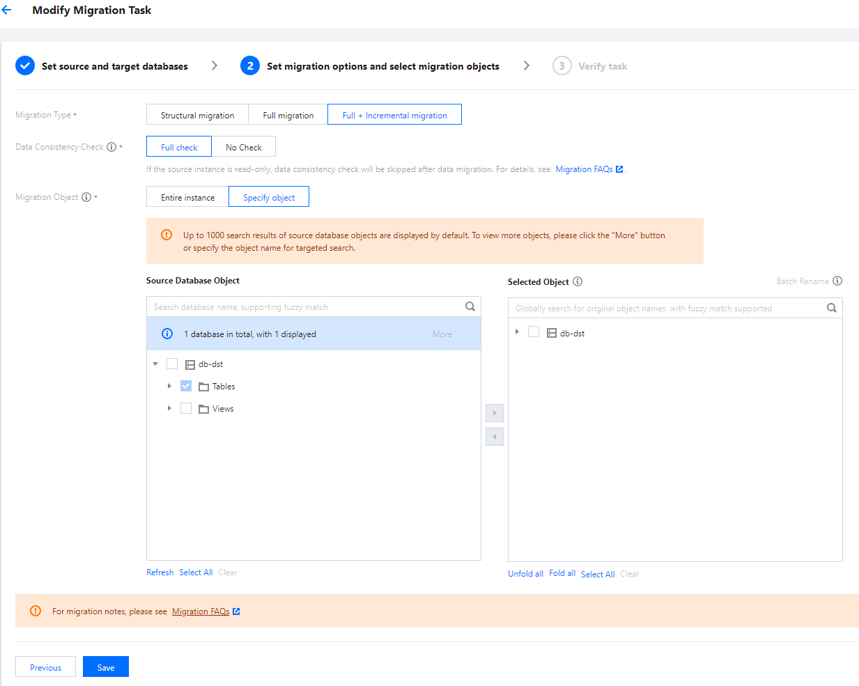 4. 마이그레이션 옵션 설정 및 마이그레이션 객체 선택 페이지에서 마이그레이션 유형과 마이그레이션 객체를 설정하고 저장을 클릭합니다.