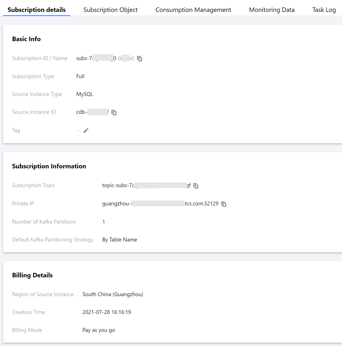 2. 다른 탭 간에 전환하여 구독 세부 정보, 구독 객체, 소비 관리 및 모니터링 데이터의 특정 정보를 조회합니다.