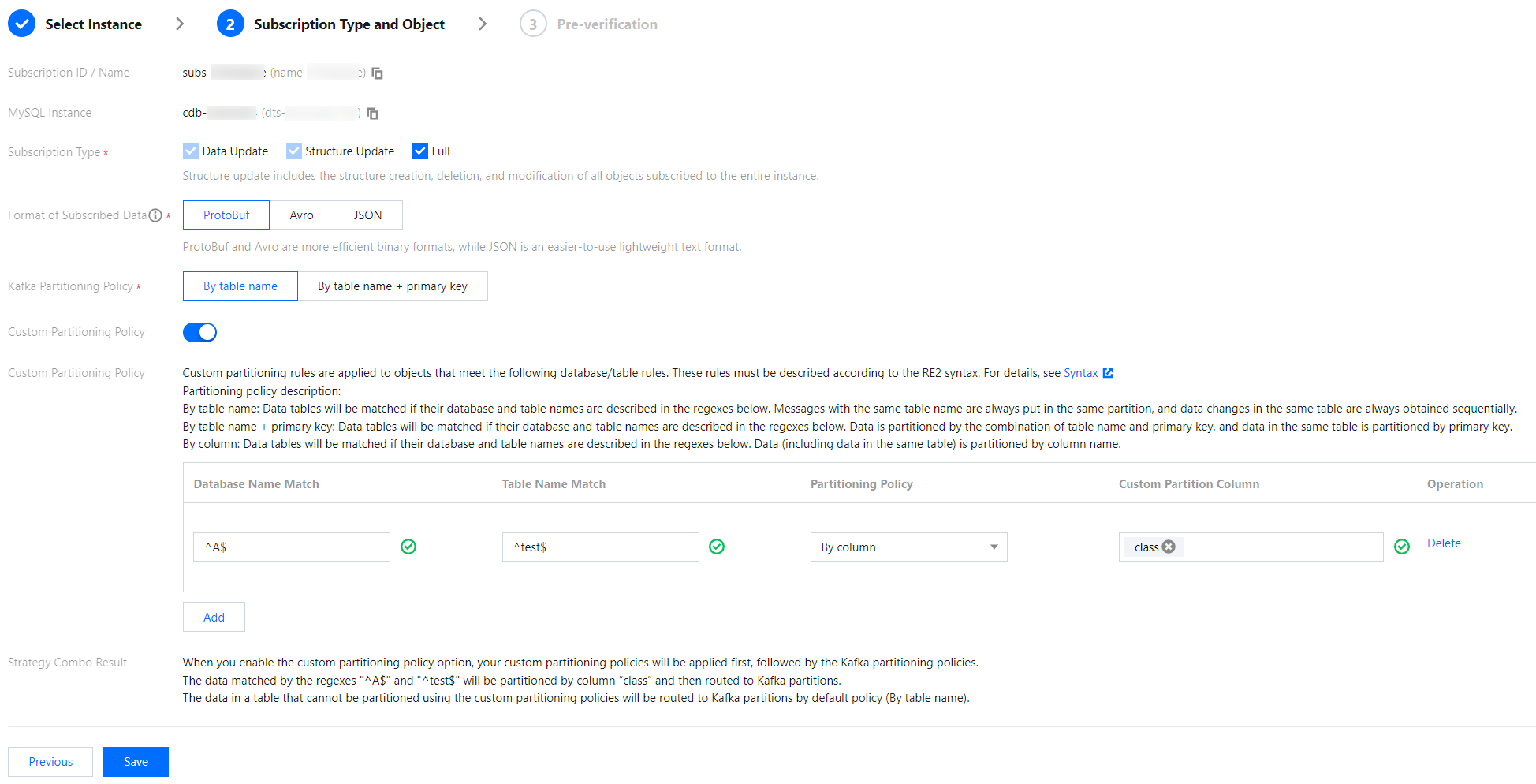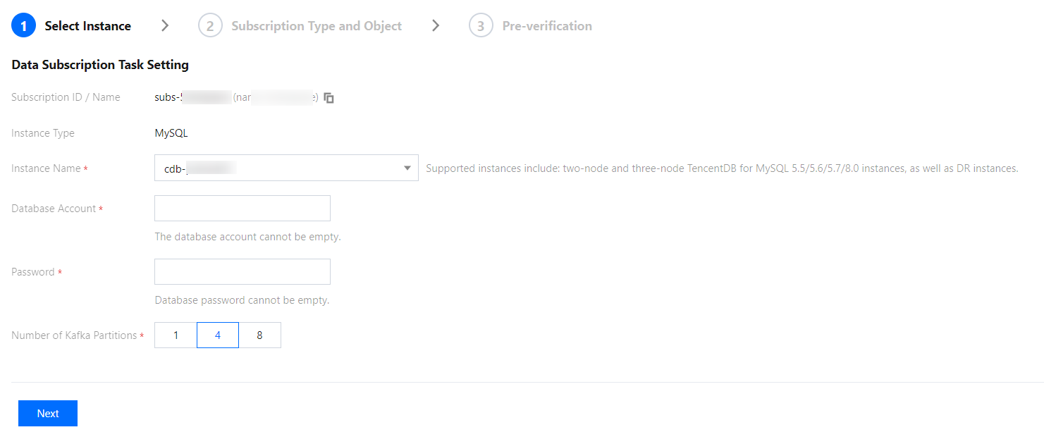 인스턴스: 데이터 인스턴스를 선택합니다. 현재 읽기 전용 및 재해 복구 인스턴스는 데이터 구독을 지원하지 않습니다.