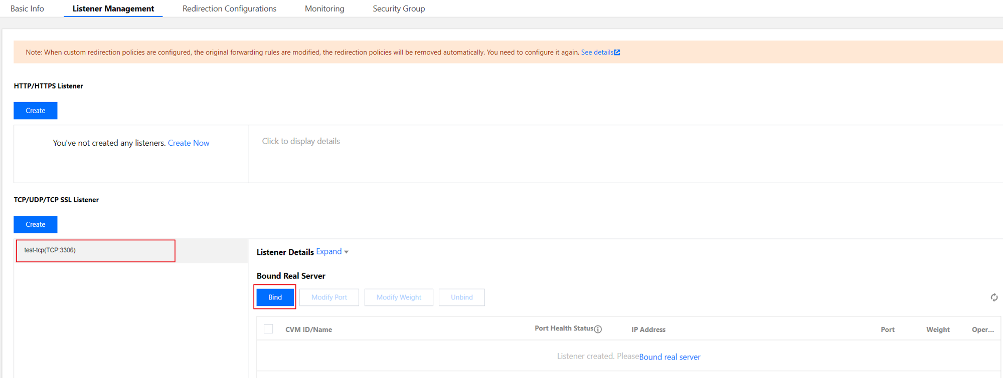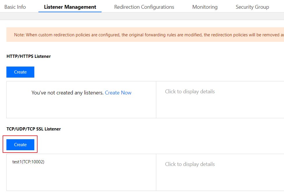 7. CLB 리스너를 생성합니다. 인스턴스 세부 정보 페이지에서 리스너 관리 탭을 클릭한 다음 TCP/UDP/TCP SSL/QUIC 리스너에서 생성을 클릭합니다.