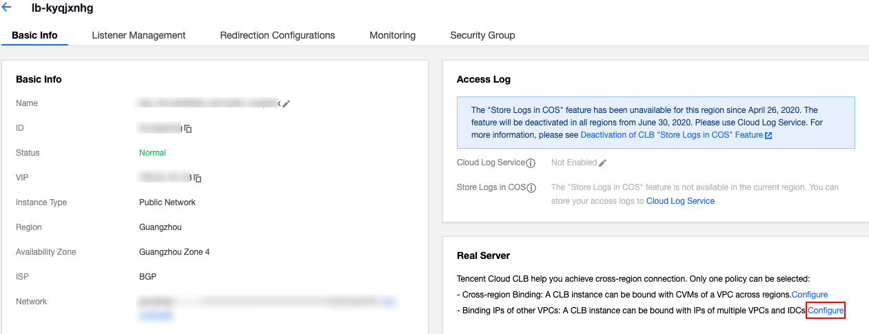 2. 기본 정보 페이지의 백엔드 서비스 영역에서, VPC가 아닌 바인딩 IP 기능을 활성화하고 구성 클릭을 클릭합니다.