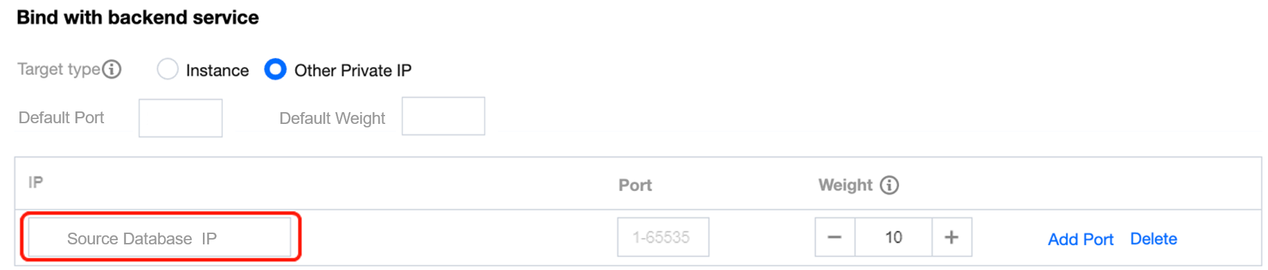 10. 팝업 창에서 기타 사설망 IP를 선택하고 바인딩할 원본 데이터베이스 IP 주소를 입력하고 포트와 가중치를 입력하고 마지막으로 확인을 클릭합니다.