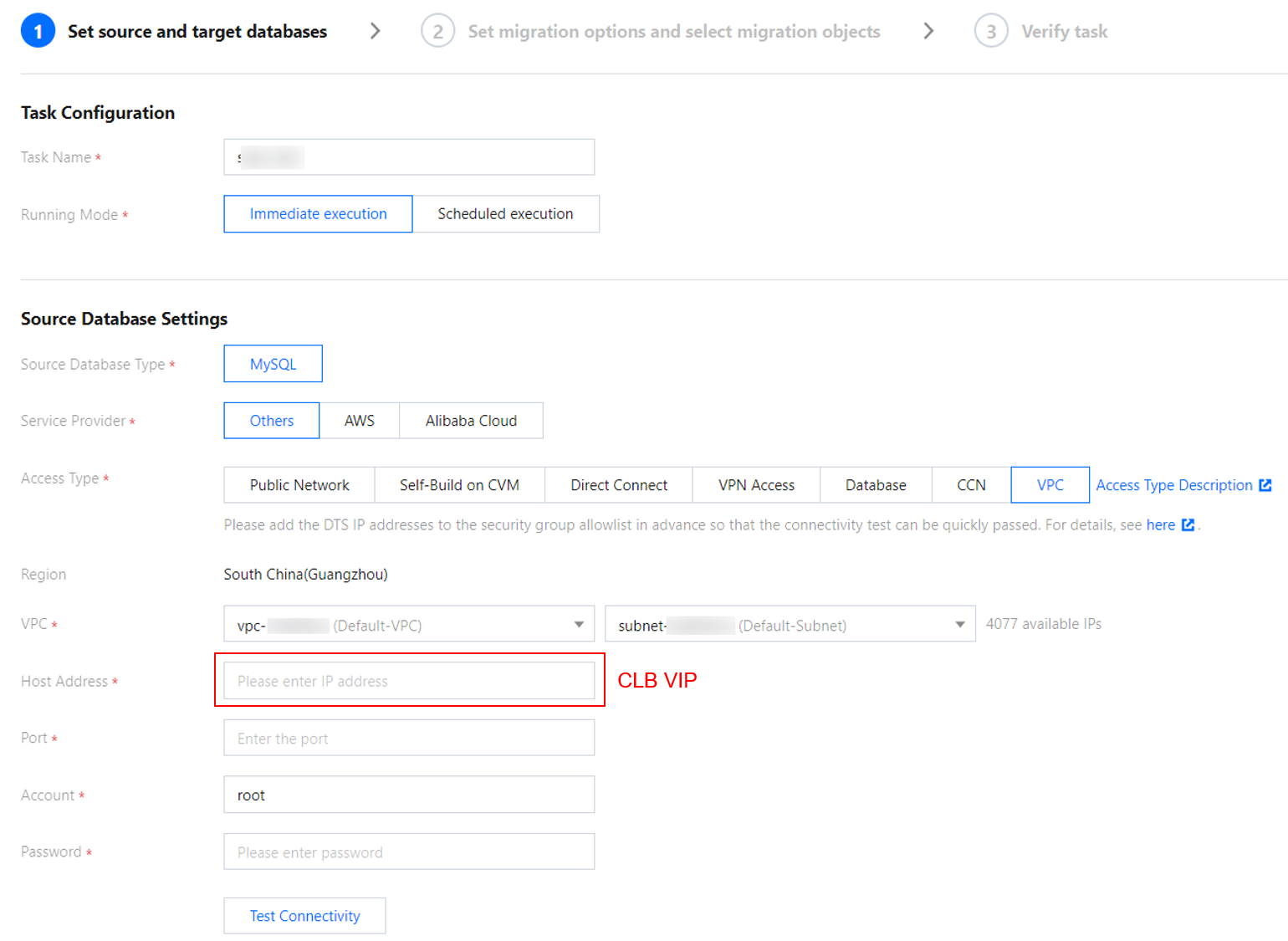 C 계정으로 데이터 마이그레이션/동기화 작업 구매 후 원본 및 대상 데이터베이스 설정 단계에서 사설망 VPC를 액세스 방식으로 선택(활성화 신청 시 티켓 제출 필요)하고, 사설망 및 서브넷의 경우 계정 C의 VPC 및 서브넷을 선택하고 호스트 주소에 CLB 인스턴스의 VIP 주소를 입력합니다.