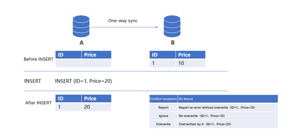 ID를 기본 키로 사용하는 A > B 단방향 동기화가 생성됩니다. A의 INSERT 문이 데이터 동기화 중에 B의 데이터와 기본 키 충돌이 있는 경우 DTS는 구성된 충돌 해결 정책에 따라 충돌을 처리합니다.