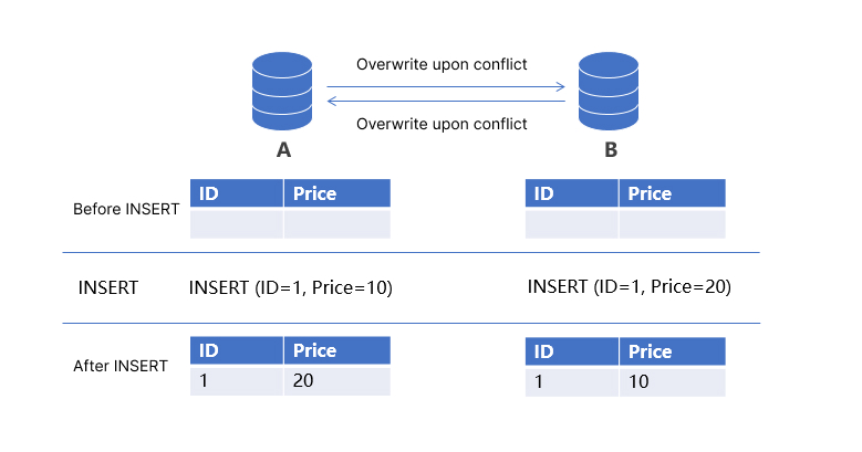 다음 양방향 동기화 시나리오에서 덮어쓰기 정책은 A > B 및 B > A 동기화 모두에 대해 설정됩니다. 기본 키가 1인 다른 데이터 레코드가 노드 A와 B에 동시에 삽입되면 결국 A와 B 사이에서 서로 교환됩니다.