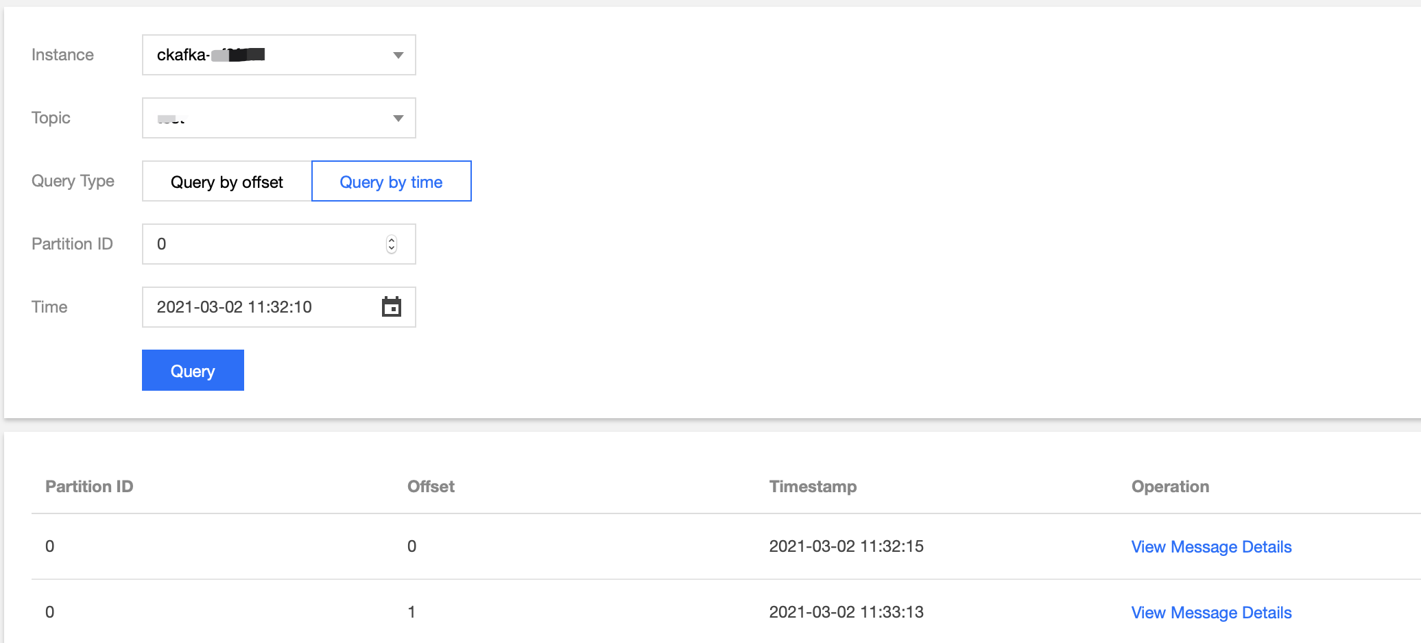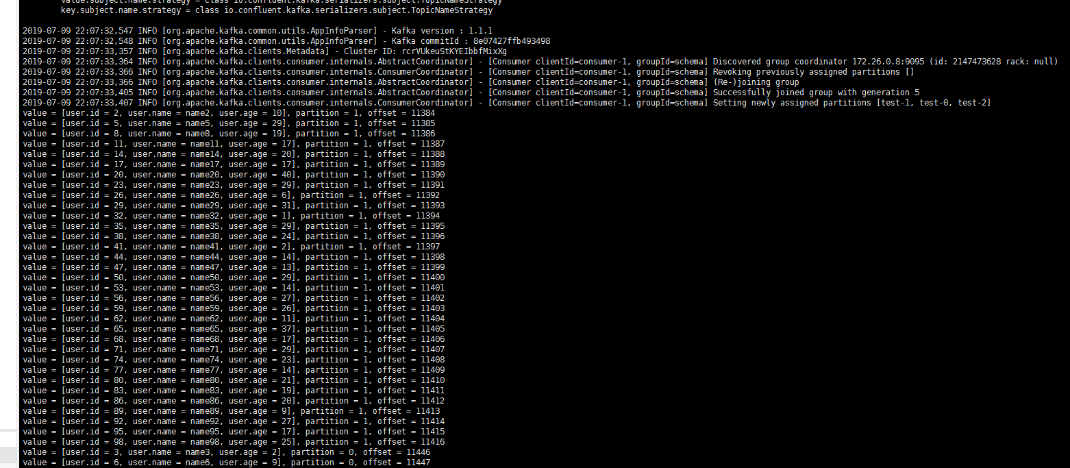 package schemaTest;import java.util.Collections;import java.util.Properties;import org.apache.avro.generic.GenericRecord;import org.apache.kafka.clients.consumer.ConsumerRecord;import org.apache.kafka.clients.consumer.ConsumerRecords;import org.apache.kafka.clients.consumer.KafkaConsumer;public class SchemaProduce {public static void main(String[] args) throws Exception {Properties props = new Properties();props.put("bootstrap.servers", "xx.xx.xx.xx:xxxx"); //Access address of the CKafka instance.props.put("group.id", "schema");props.put("key.deserializer", "org.apache.kafka.common.serialization.StringDeserializer");// Use the Confluent KafkaAvroDeserializer.props.put("value.deserializer", "io.confluent.kafka.serializers.KafkaAvroDeserializer");// Add the schema service address to obtain the schema.props.put("schema.registry.url", "http://127.0.0.1:8081");KafkaConsumer<String, GenericRecord> consumer = new KafkaConsumer<>(props);consumer.subscribe(Collections.singletonList("test"));try {while (true) {ConsumerRecords<String, GenericRecord> records = consumer.poll(10);for (ConsumerRecord<String, GenericRecord> record : records) {GenericRecord user = record.value();System.out.println("value = [user.id = " + user.get("id") + ", " + "user.name = "+ user.get("name") + ", " + "user.age = " + user.get("age") + "], "+ "partition = " + record.partition() + ", " + "offset = " + record.offset());}}} finally {consumer.close();}}}