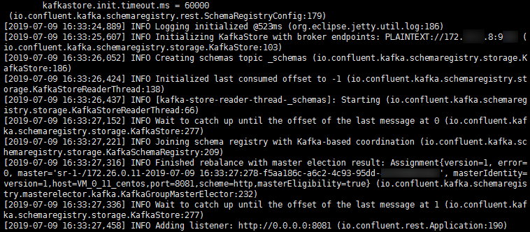 kafkastore.bootstrap.servers=SASL_PLAINTEXT://ckafka-xxxx.ap-xxx.ckafka.tencentcloudmq.com:50004 kafkastore.security.protocol=SASL_PLAINTEXT kafkastore.sasl.mechanism=PLAIN kafkastore.sasl.jaas.config=org.apache.kafka.common.security.plain.PlainLoginModule required username='ckafka-xxxx#xxxx' password='xxxx';kafkastore.topic=schemasdebug=true