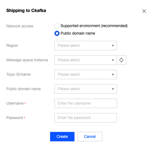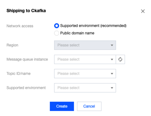 Supporting Environment Access: You can select this access method on the condition that you have purchased a Tencent Cloud product that can be used in conjunction with CKafka. Select a message queue instance, IP address, and port.