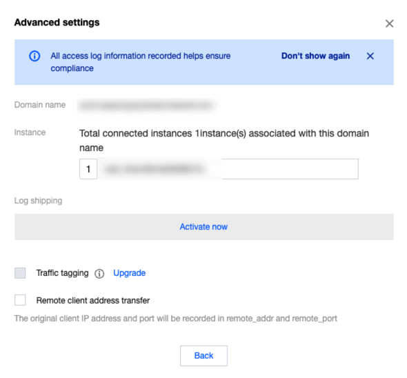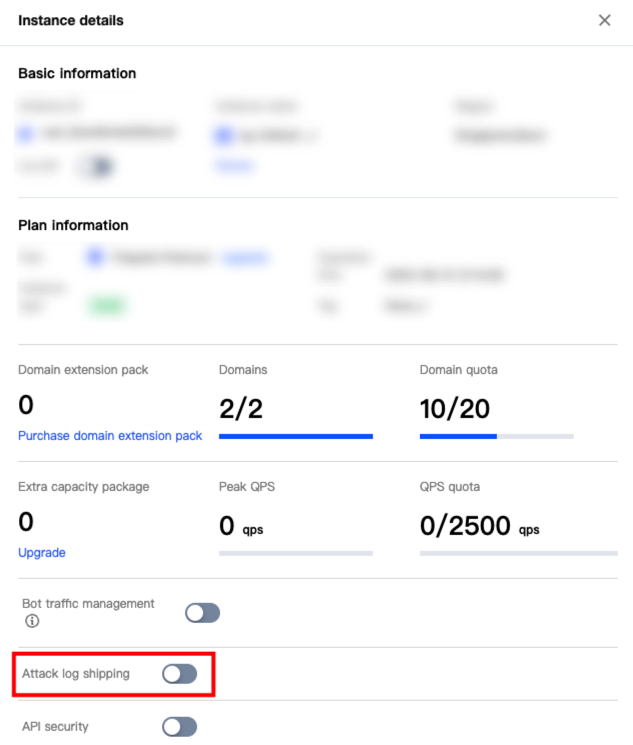 3. In Instance Details, click to enable attack log shipping for the current instance. Enabling Access Log Shipping