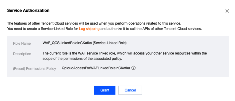 2.3 On the CAM authorization page, click Grant Authorization to grant WAF the CKafka data shipping permissions. If you encounter any issues during authorization, see the CAM documentation. 2.4 After clicking Grant Authorization, you can go back to the log shipping page and click Configure Now to trigger the pop-up window for CKafka shipping configuration.