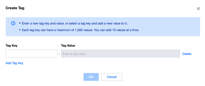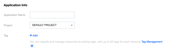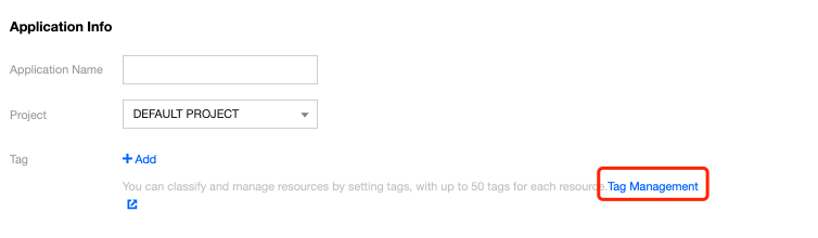 애플리케이션 생성 시 ‘+추가’를 클릭하여 애플리케이션에 기존 태그를 추가할 수 있습니다. 태그가 생성되지 않은 경우 아래 단계에 따라 태그를 생성할 수 있습니다. 1. 애플리케이션 생성 시 애플리케이션 정보 섹션의 태그 관리를 클릭하여 태그 목록 페이지로 이동할 수 있습니다. 2. 태그 생성을 클릭하고 태그 정보를 입력합니다.
