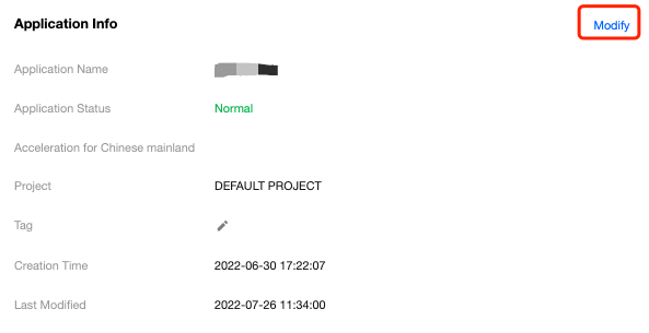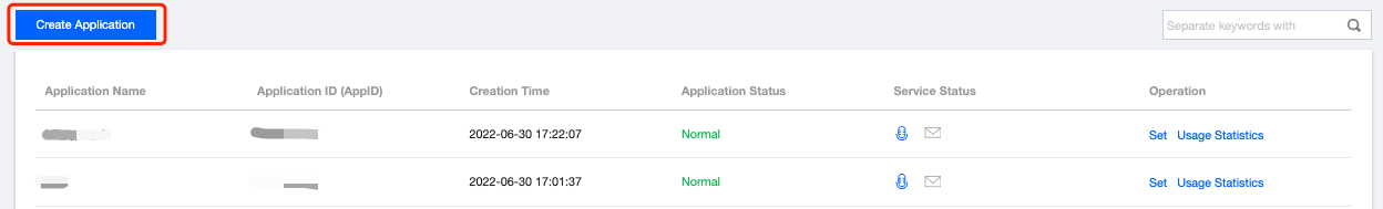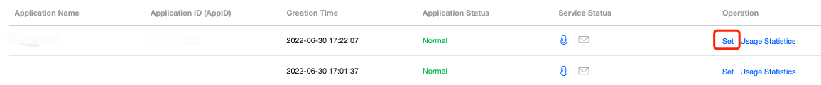 생성된 애플리케이션은 서비스 관리 페이지의 ‘애플리케이션 목록’에 표시됩니다. 설정을 클릭하여 애플리케이션 세부 정보 페이지로 이동합니다.