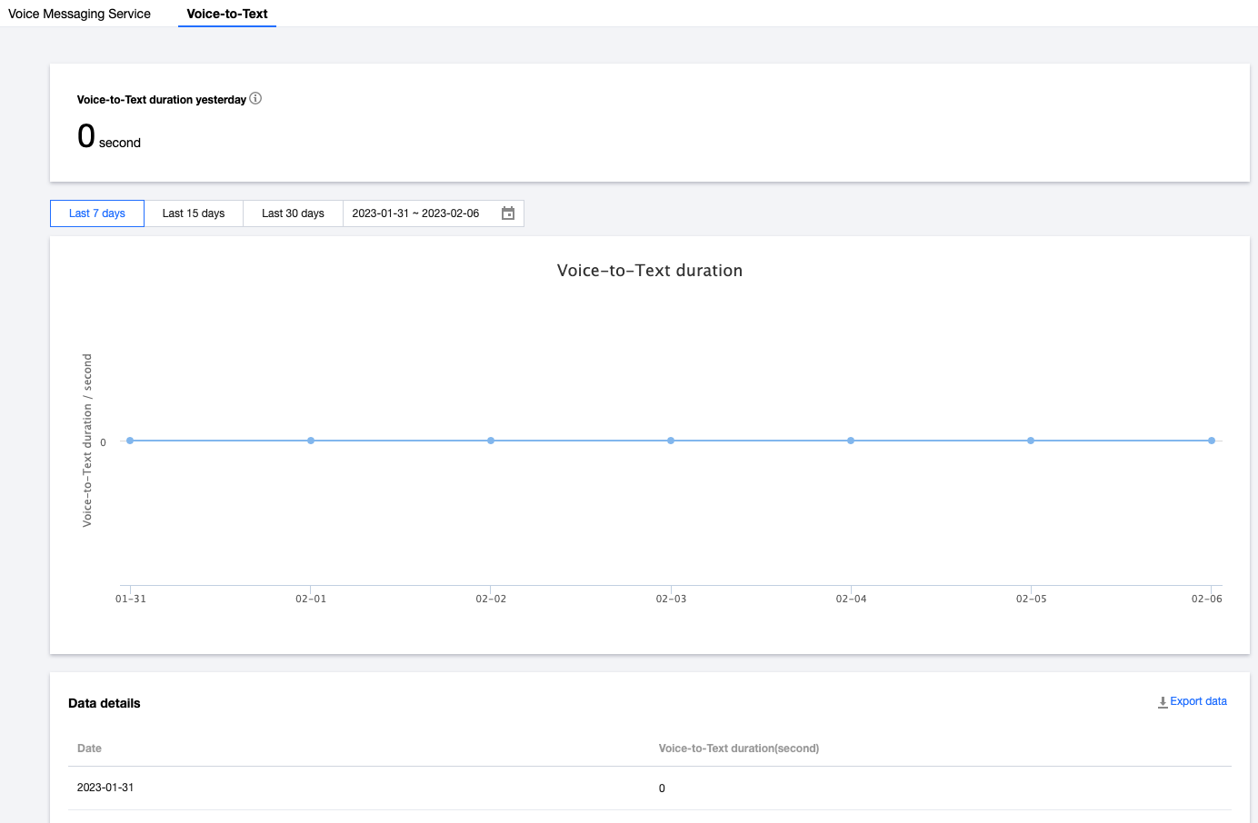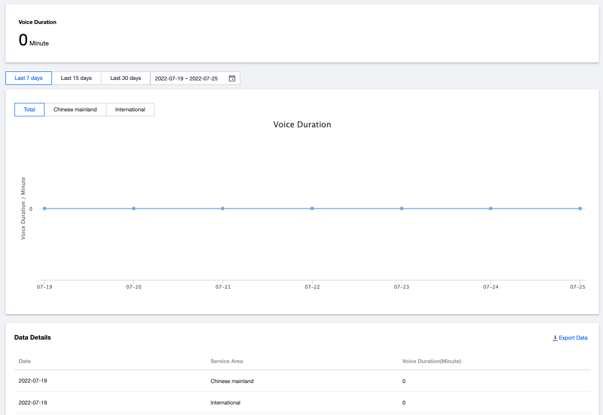 꺾은선 그래프는 기본적으로 지난 7일 동안의 음성 지속 시간을 표시합니다. 다른 시간 범위 및 리전을 선택하여 사용량 데이터를 조회할 수 있습니다.