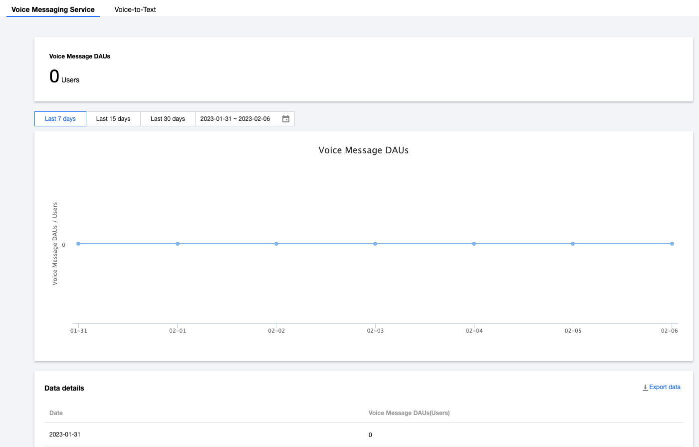 음성 메시지 DAU 사용량 통계가 상단에 표시됩니다.
