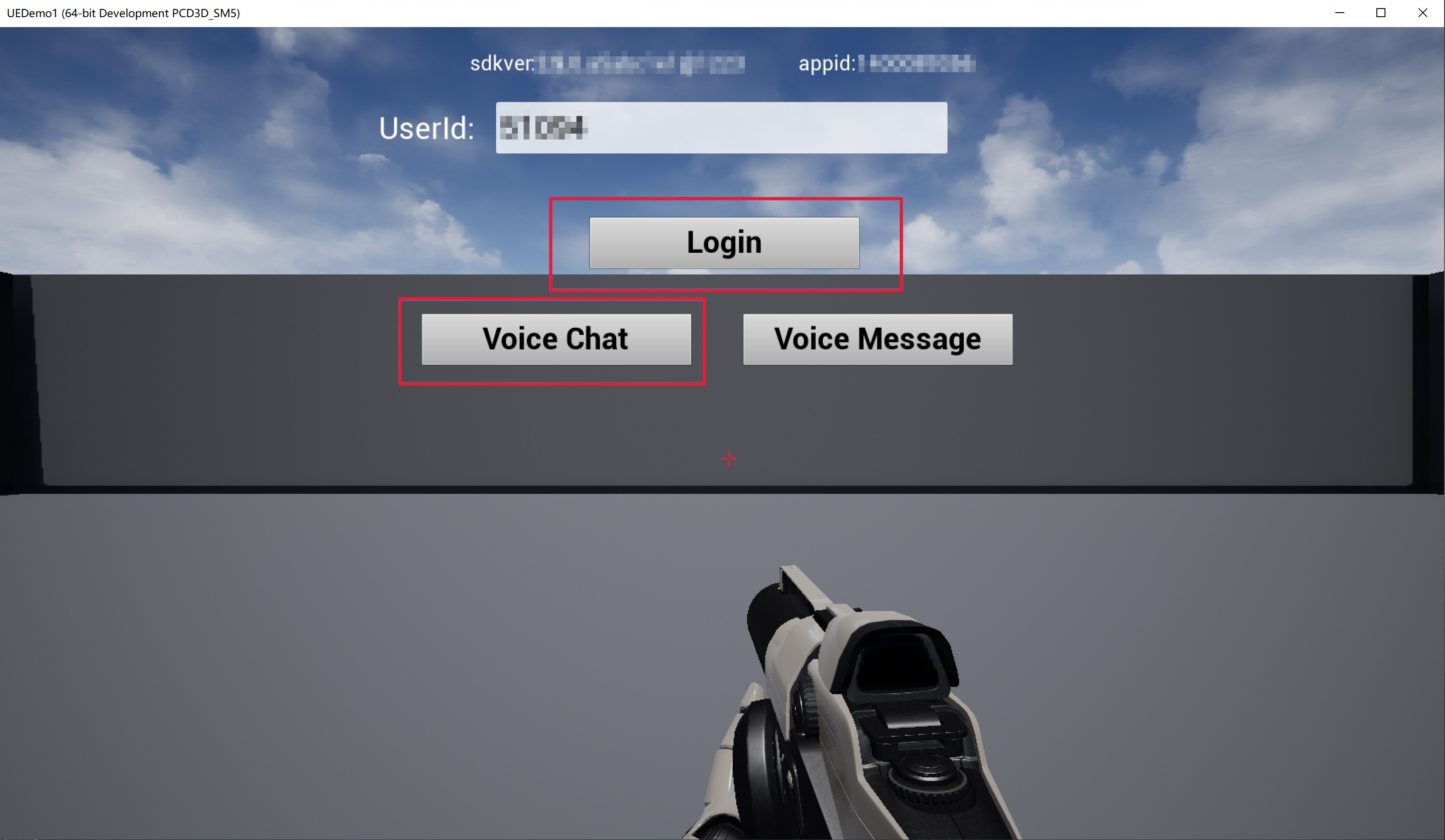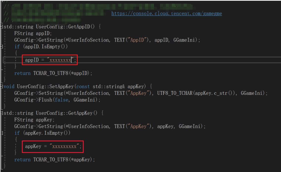 int UBaseViewController::InitGME(std::string sdkAppId, std::string sdkAppKey, std::string userId) {int nAppid = atoi(sdkAppId.c_str());int ret = ITMGContextGetInstance()->Init(sdkAppId.c_str(), userId.c_str());ITMGContextGetInstance()->SetTMGDelegate(this);int RetCode = (int) ITMGContextGetInstance()->CheckMicPermission();FString msg = FString::Printf(TEXT("check Permission retcode =%d"), RetCode);GEngine->AddOnScreenDebugMessage(INDEX_NONE, 10.0f, FColor::Yellow, *msg);char strSig[128] = {0};unsigned int nLength = 128;nLength = QAVSDK_AuthBuffer_GenAuthBuffer(nAppid, "0", userId.c_str(), sdkAppKey.c_str(), (unsigned char *)strSig, nLength);ITMGContextGetInstance()->GetPTT()->ApplyPTTAuthbuffer(strSig, nLength);m_appId = sdkAppId;m_appKey = sdkAppKey;m_userId = userId;m_isEnableTips = false;m_tipsMark = 0;return ret;}