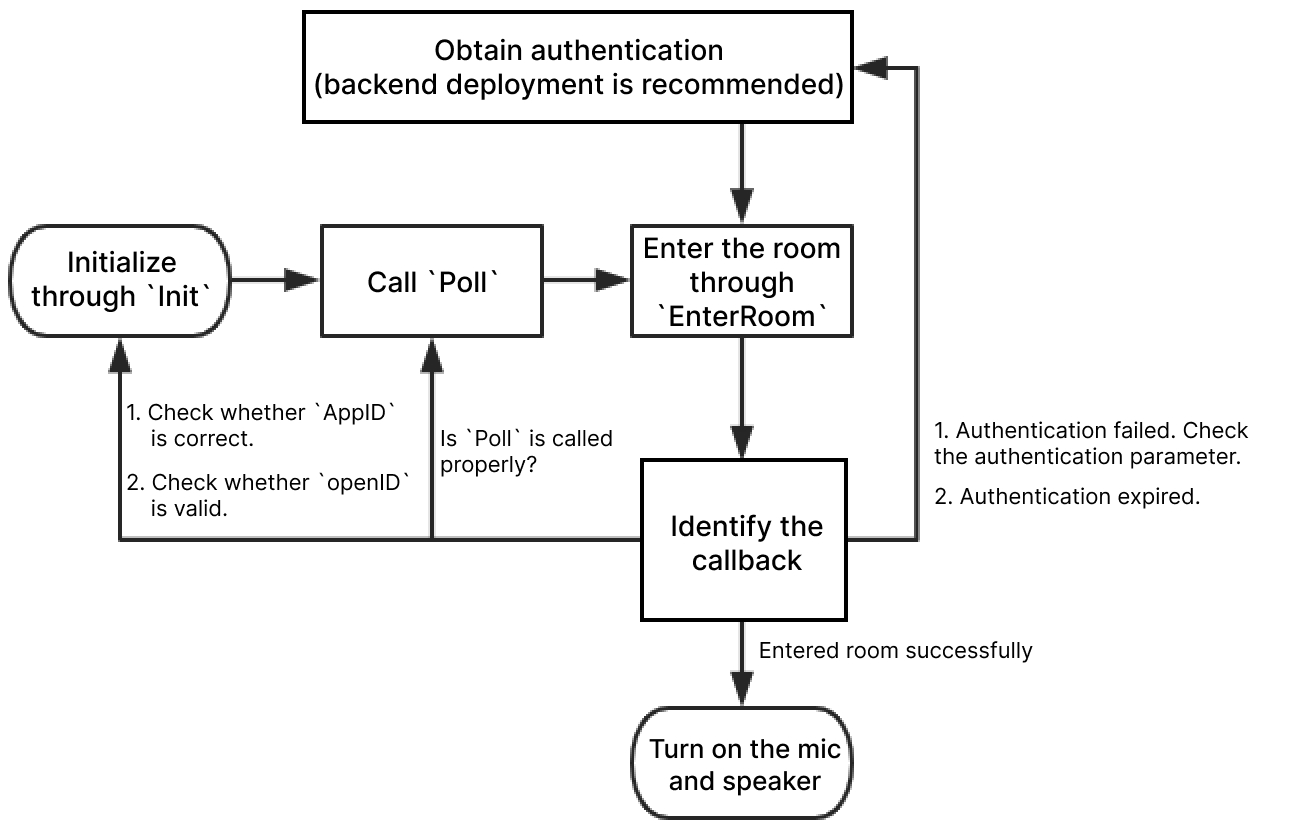 ITMGContext.GetInstance(this).Init(String.valueOf(mAppId), mUserId);//sdk 초기화ITMGContext.GetInstance(this).SetTMGDelegate(new MyDelegate());//다양한 콜백 및 이벤트 수신에 사용되는 프록시 클래스 설정EnginePollHelper.createEnginePollHelper();//콜백을 트리거하기 위해 Poll 함수를 주기적으로 호출byte[] authbuff = AuthBuffer.getInstance().genAuthBuffer(mAppId, mRoomId, mUserId,mAppKey);//인증 정보 가져오기ITMGContext.GetInstance(this).EnterRoom(mRoomId, 2, authbuff);//방 입장