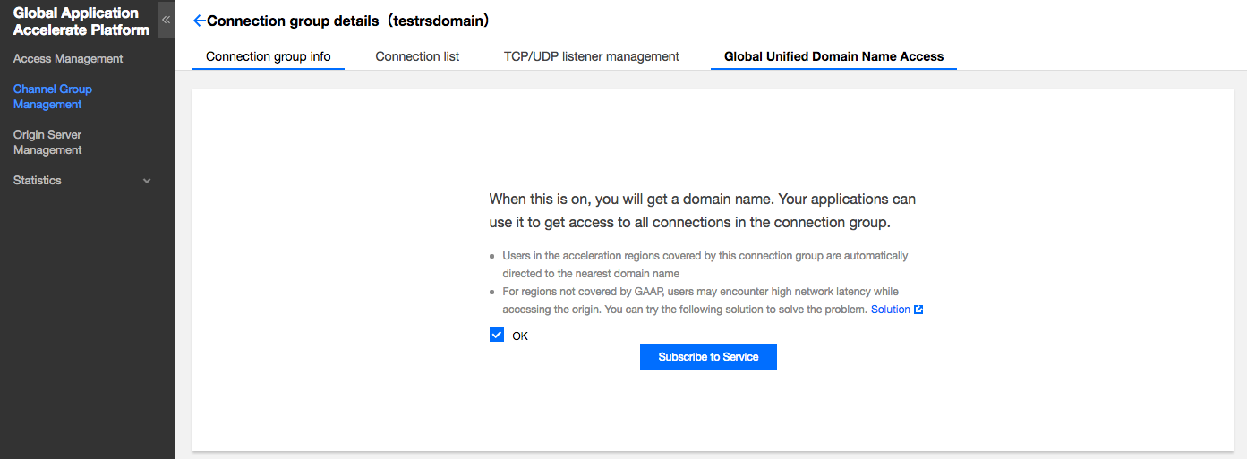 채널 그룹에 대한 서비스를 개설한 경우, 채널 그룹에 대한 World Wide Name 액세스가 가능한 서비스를 받을 경우, 채널이나 공용 네트워크를 통해 소스 영역에 액세스할 수 있도록 인터페이스를 구성하여 채널 적용 가속 영역을 정밀하게 조정할 수 있는 통합 도메인 이름을 얻을 수 있습니다.