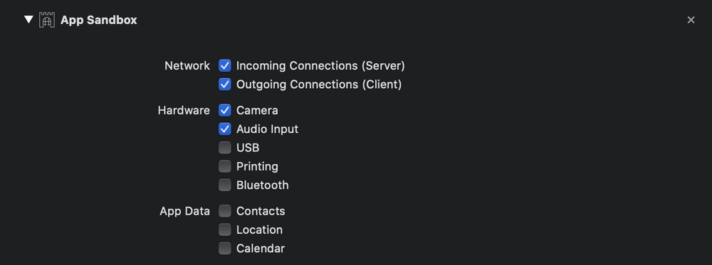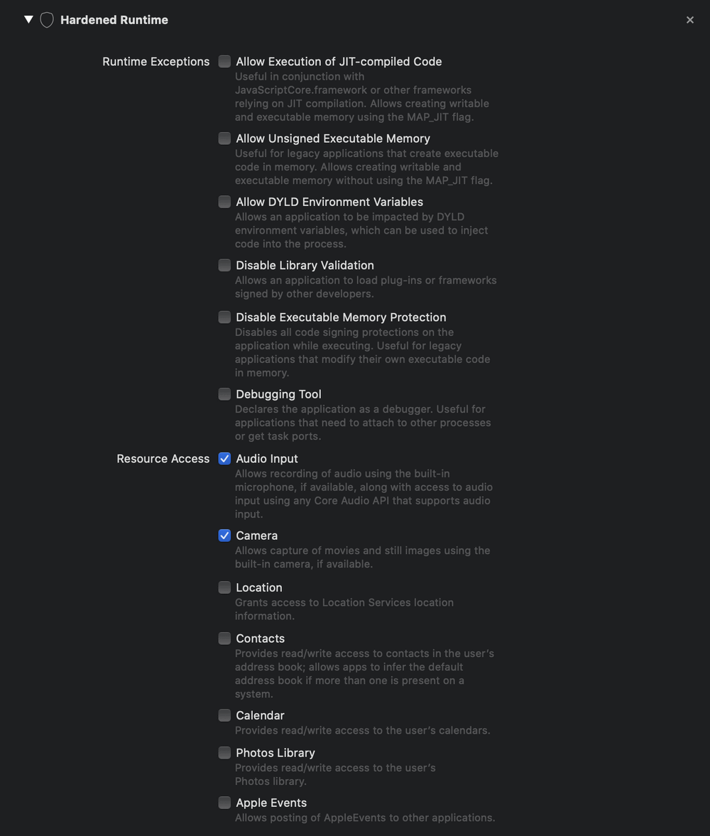 App에서 App Sandbox 또는 Hardened Runtime을 활성화한 경우 Network, Camera, Audio Input 항목을 선택해야 합니다.