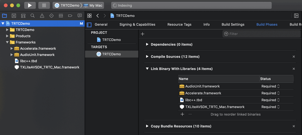 5. 다운로드한 SDK Framework와 필수 종속성을 'TXFFmpeg.xcframework', 'TXSoundTouch.xcframework', 'libc++.tbd', 'Accelerate.framework', 'SystemConfiguration.framework', 'MetalKit.framework' 순서로 추가합니다.추가하면 다음 이미지와 같아집니다.