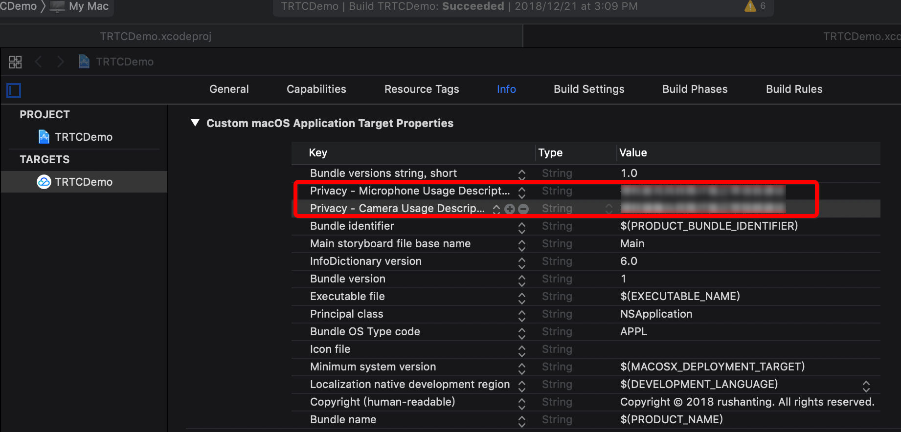 SDK의 멀티미디어 기능을 사용하려면 마이크와 카메라의 사용 권한 허용이 필요합니다. 앱의 Info.plist에 마이크와 카메라의 사용 권한 대화 상자가 시스템에 팝업될 때 표시되는 안내 정보인 다음 두 항목을 추가합니다.