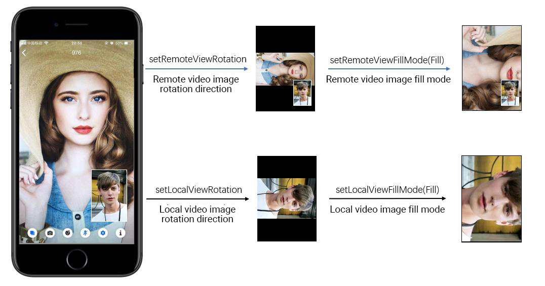 setRemoteViewFillMode | 원격 영상 화면의 채우기 모드 | 검은 테두리 자르기 또는 남기기 |